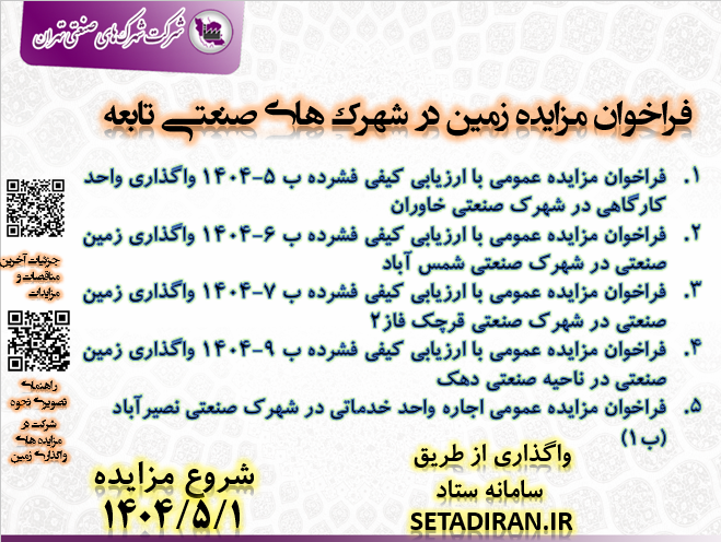 فراخوان مزایده عمومی با ارزیابی کیفی فشرده ب 5-1404 واگذاری واحد کارگاهی در شهرک صنعتی خاوران