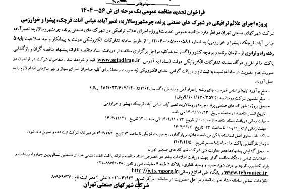 فراخوان تجدید مناقصه عمومی یک مرحله ای ش 56-1404 پروژه اجرای علائم ترافیکی در شهرک های صنعتی پرند چرمشهر و سالاریه نصیرآباد عباس آباد قرچک پیشوا و خوارزمی