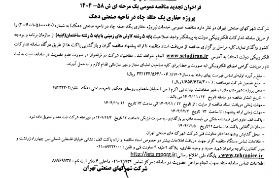 فراخوان تجدید مناقصه عمومی یک مرحله ای ش 58-1404 پروژه حفاری یک حلقه چاه آب در ناحیه صنعتی دهک