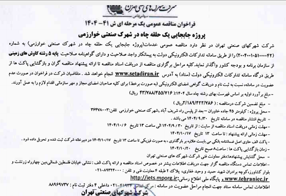 فراخوان مناقصه عمومی یک مرحله ای ش 41-1404پروژه جابه جایی یک حلقه چاه در شهرک صنعتی خوارزمی