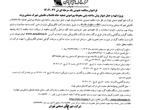 فراخوان مناقصه عمومی یک مرحله ای ش 42-1404 پروژه تهیه و حمل دیوار پیش ساخته بتنی محوطه پیرامونی تصفیه خانه فاضلاب تکمیلی شهرک صنعتی پرند 1404/09/26 - 13:41 - تعداد بازدید: 20 - تعداد بازدیدکننده: 15 - کد خبر : 37029 - گروه خبری : گروه مناقصات و مزایدات,گروه آرشیو تمام اخبار استان - تعداد نظرات : 0