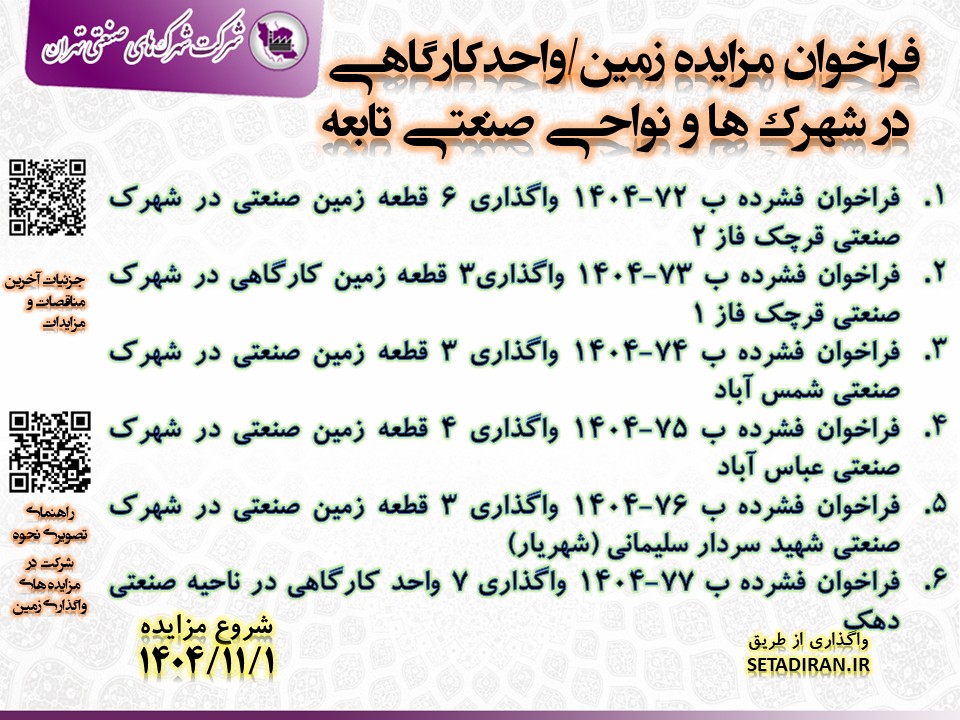 مزایده زمین / واحد صنعتی در شهرک ها و نواحی صنعتی تابعه 1404/11/05 - 14:10 - تعداد بازدید: 170 - تعداد بازدیدکننده: 91 - کد خبر : 37404 - گروه خبری : گروه مناقصات و مزایدات,گروه آرشیو تمام اخبار استان - تعداد نظرات : 0