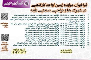 مزایده واگذاری زمین تجاری / کارگاهی / صنعتی و واحد کارگاهی در شهرک ها و نواحی صنعتی تابعه 13 بهمن 1404 1404/11/13 - 16:34 - تعداد بازدید: 150 - تعداد بازدیدکننده: 61 - کد خبر : 37588 - گروه خبری : گروه مناقصات و مزایدات,گروه آرشیو تمام اخبار استان - تعداد نظرات : 0