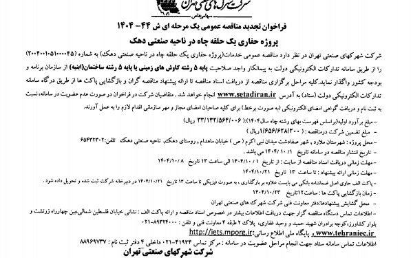 فراخوان تجدید مناقصه عمومی یک مرحله ای ش 44-1404 پروژه حفاری یک حلقه چاه در ناحیه صنعتی دهک