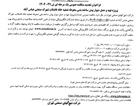 فراخوان تجدید مناقصه عمومی یک مرحله ای ش 49-1404 پروژه حمل و نصب تجهیزات ساختمان آتش نشانی و راهبری و بهره برداری از ایستگاه آتش نشانی و شیرهای هیدرانت شهرک صنعتی دماوند 2