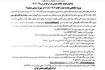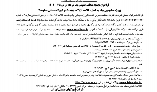 فراخوان تجدید مناقصه یک مرحله ای ش35-1404 پروژه جابجایی چاه به شماره کلاسه 1008/002/6 در شهرک صنعتی دماوند 2