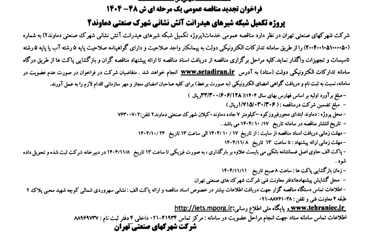 فراخوان تجدید مناقصه یک مرحله ای ش48-1404 پروژه تکمیل شیرهای هیدرانت آتش نشانی شهرک صنعتی دماوند 2