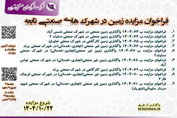 فراخوان مزایده زمین صنعتی / تجاری در شهرک های صنعتی تابعه (22 دیماه 1404) 1404/10/21 - 16:01 - تعداد بازدید: 679 - تعداد بازدیدکننده: 296 - کد خبر : 37320 - گروه خبری : گروه مناقصات و مزایدات,گروه آرشیو تمام اخبار استان - تعداد نظرات : 0