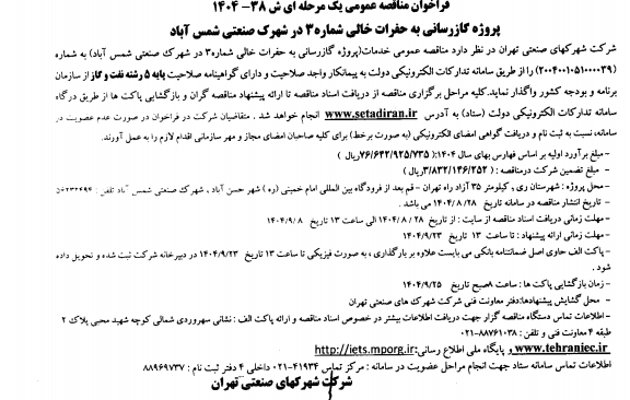 فراخوان مناقصه عمومی یک مرحله ای ش 38-1404 (پروژه گاز رسانی به حفرات خالی شماره 3 در شهرک صنعتی شمس آباد) گروه خبری : گروه مناقصات و مزایدات,گروه آرشیو تمام اخبار استان کد خبر : 35566 کلمات کلیدی